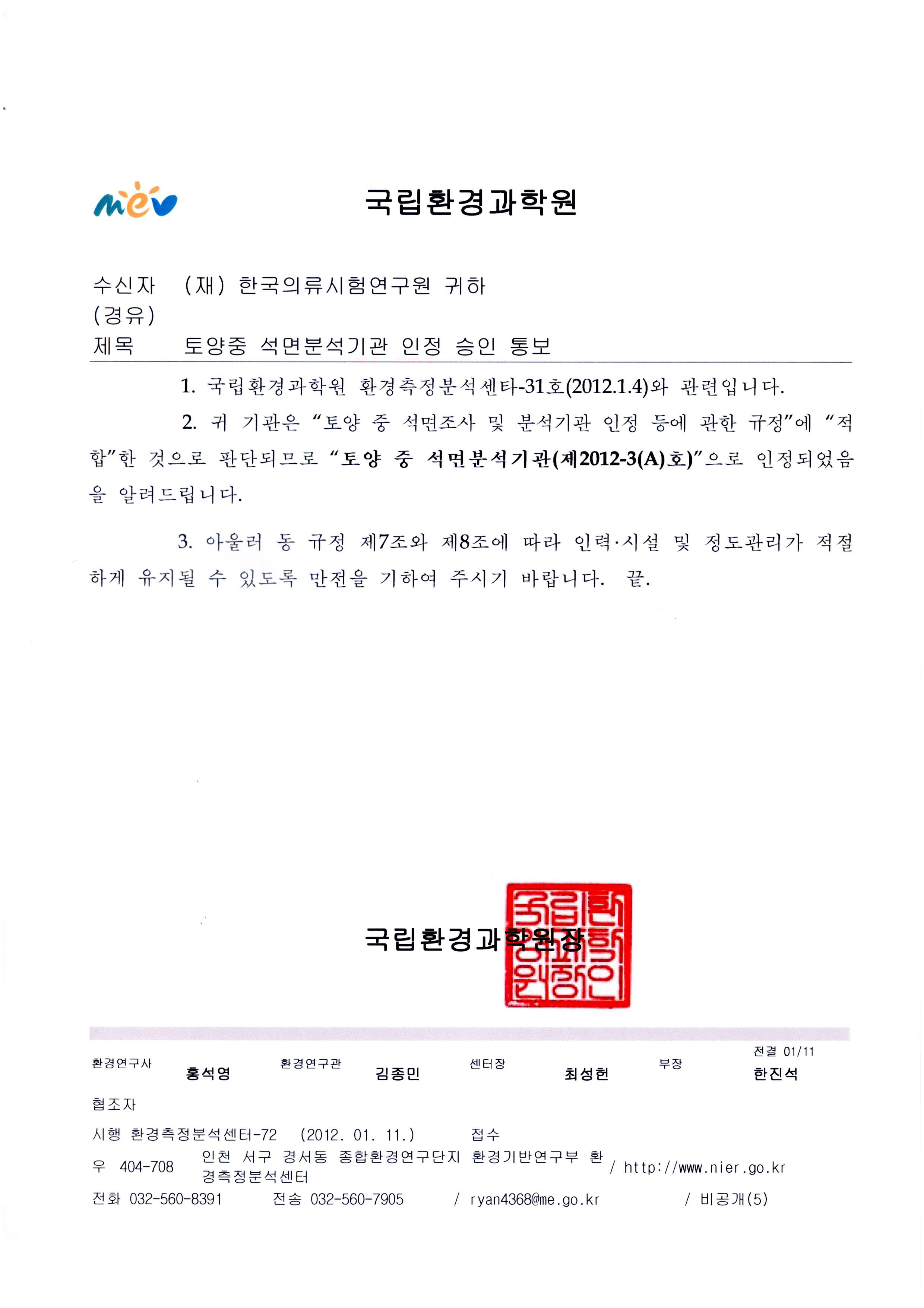 토양중 석면분석기관(제2012-3(A)호) 지정 2012-01-31 |